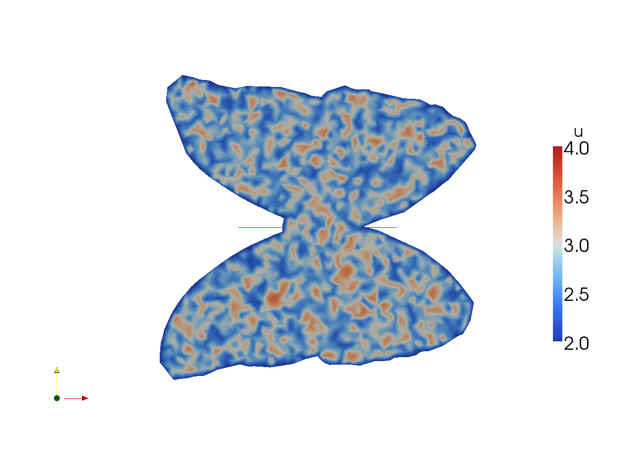 on a 2d butterfly-shaped domain. We impose non-zero Dirichlet boundary conditions and an initial condition that is a random perturbation of the spatially uniform steady state of the system.